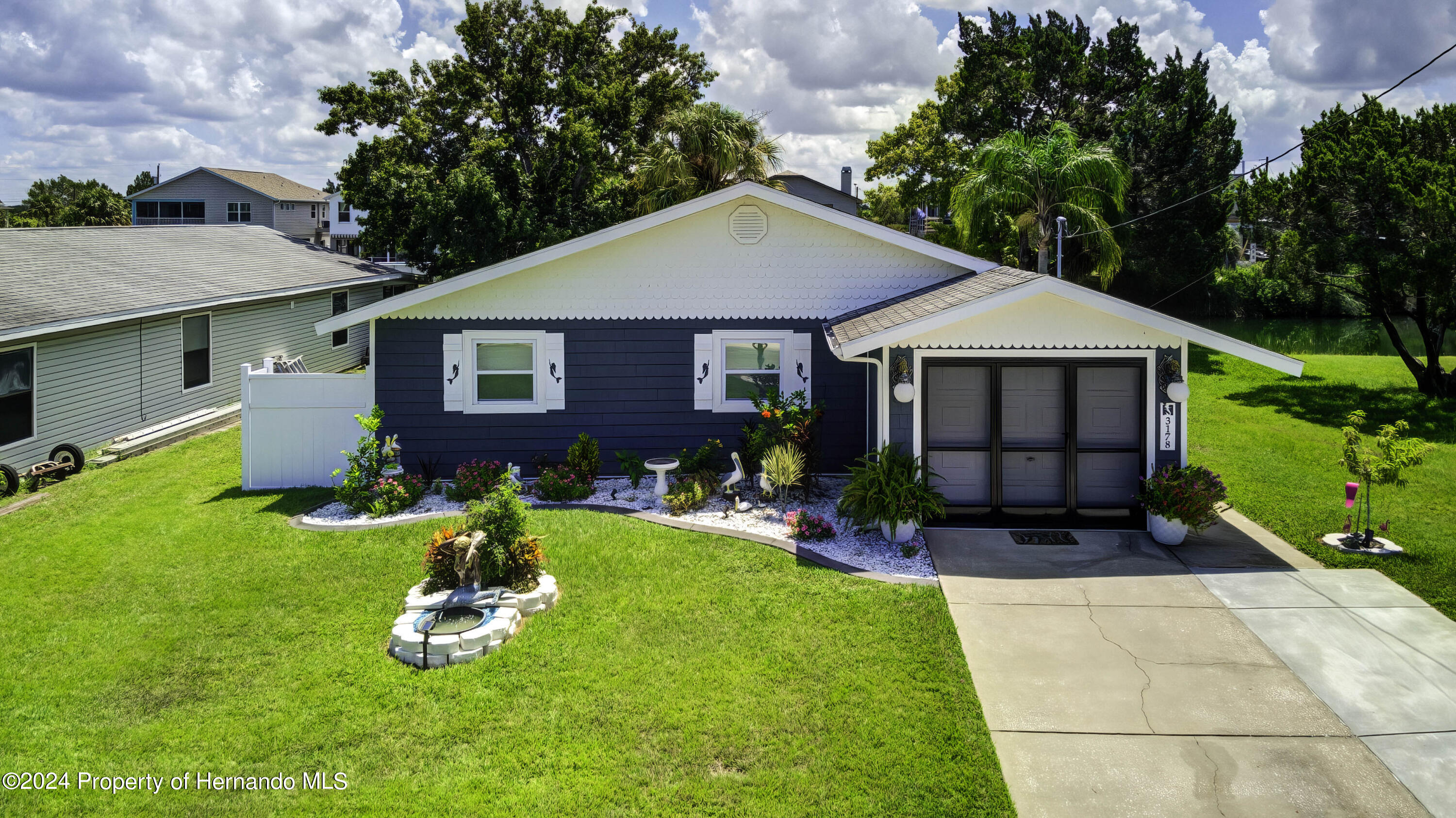 NEW ROOF MARCH 2026, NEW HVAC November 2025! DID NOT FLOOD DURING HURRICANE HELENE OR MILTON! MOVE IN READY! Excellent opportunity to own your waterfront oasis in Hernando Beach, a golf cart community, where coastal living meets modern comfort at an affordable price! Whether this is your primary residence, 2nd home, or short term/vacation property, this immaculate 2 bedroom, 2 bath home offers everything you need for a tranquil waterfront lifestyle, boasting a prime location along a waterfront canal with a deck, short boat ride to the Gulf. Step inside to discover an inviting open floor plan that seamlessly connects the living room, dining area, and kitchen, featuring stunning granite countertops and decorative shelves. The brand new refrigerator (2024) with a digital screen adds a touch of luxury to your culinary adventures. The spacious primary bedroom easily accommodates a king size bed and includes an ensuite bathroom with a refreshing shower, providing a perfect retreat after a long day. The guest bedroom is equally inviting, ensuring your visitors feel right at home. Outside, the property truly shines with its beautifully landscaped front yard, complete with a charming mermaid waterfall, whimsical mermaid mailbox, and playful mermaid lights adorning the garage. The expansive screened patio is perfect for entertaining or unwinding, featuring a brand new hot tub (2023), a small refrigerator, and a wine cooler for your convenience. Step out onto the lovely deck to enjoy fishing right from your propertyimagine catching dinner or savoring some delicious blue crabs without ever leaving your yard! Boaters will revel in the 50 foot seawall providing easy access to the beautiful waterways of Hernando Beach, allowing you to fully embrace the Florida lifestyle. For those who enjoy tinkering, the garage is a dream come true, equipped with ample storage cabinets and a workbench, plus a convenient 6 x 10 shed in the fenced in backyard for even more storage. You'll also have peace of mind knowing this impeccably maintained home features new windows, siding, and soffit (2023), new hot water heater, transferable termite protection with most recent inspection Feb 2026, and quarterly pest control. Every appliance is included, making this home move in ready! This property has no short term rental restrictions, so if you are considering an investment property! This one is for you! Mr. and Mrs. Immaculate have lovingly cared for this beautiful home and are excited to pass it on to you. Don't miss this rare opportunity to own a piece of paradise in Hernando Beach. Schedule your private showing today and start living your dream!